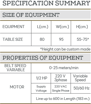 • Adjustable Belt Speed: The conveyor belt speed can be adjusted up to 25 meters per minute, powered by AC 220 Volt Single Phase 50/60 Hz.